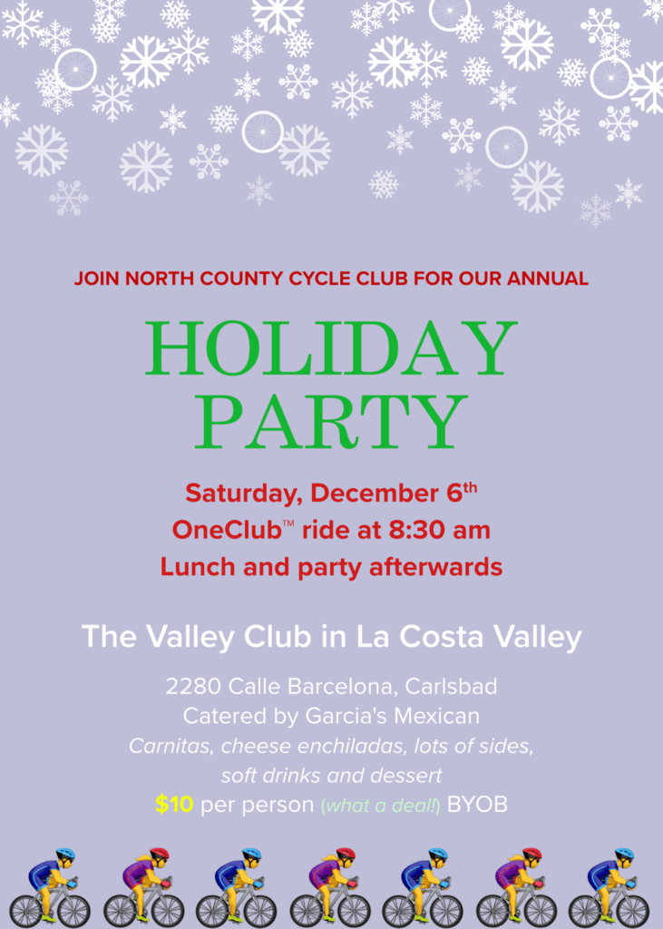 For more details and the registration link please visit https://northcountycycleclub.org/holiday-party.